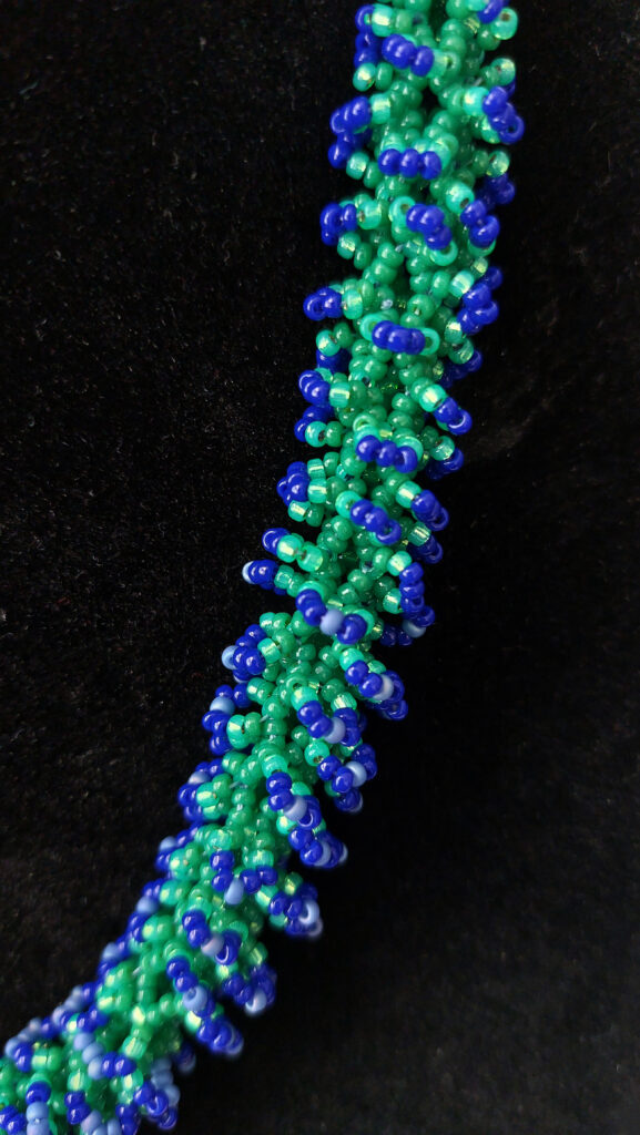 Deze abstracte ketting is een mooie blikvanger. De kleuren blauw en groen verlopen mooi in de ketting en ook de dikte van de ketting verloopt van slotje naar voorkant.