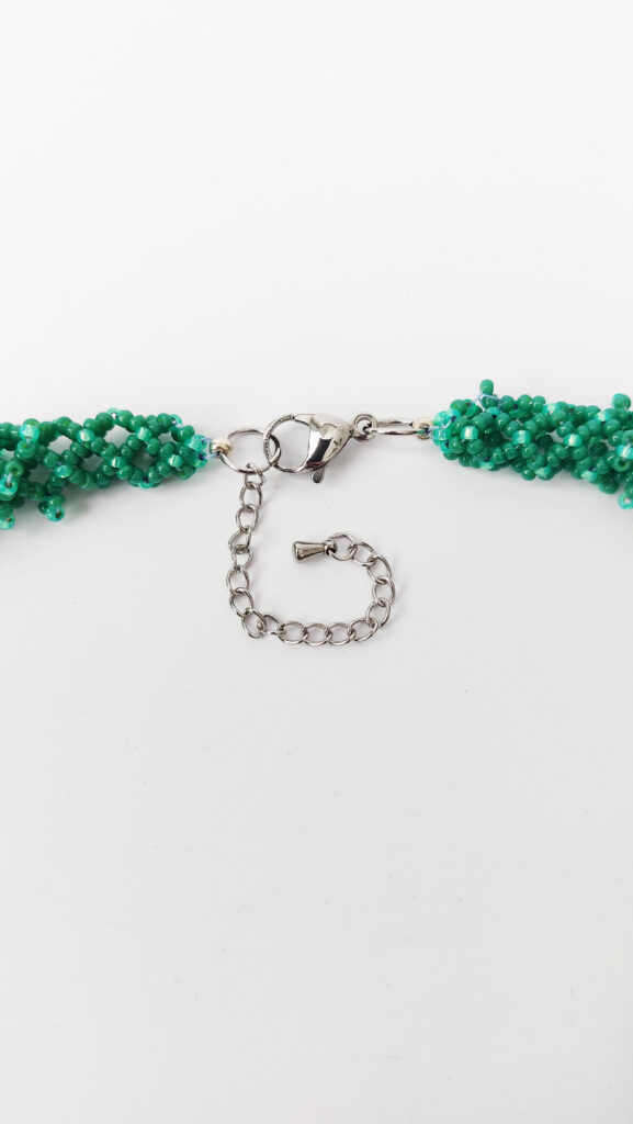 De sluiting is gemaakt van roestvrij staal, dus ook bij een gevoelige huid veilig te dragen. De lengte van de ketting is circa 48 cm met een extra verlengkettinkje van circa 5 cm. Er zijn circa 4500 kraaltjes verwerkt in dit sieraad.