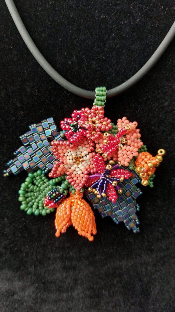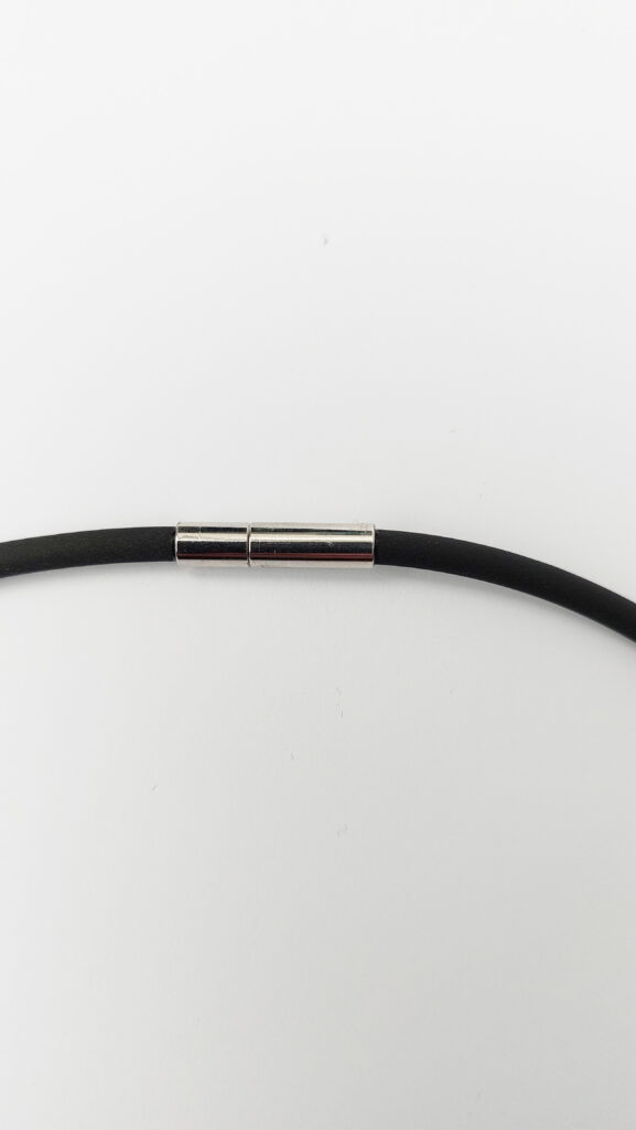 De sluiting is gemaakt van roestvrij staal, dus ook bij een gevoelige huid veilig te dragen. De lengte van de (caoutchouc) ketting is circa 45 cm. Er zijn meer dan 1800 kraaltjes verwerkt in dit sieraad.