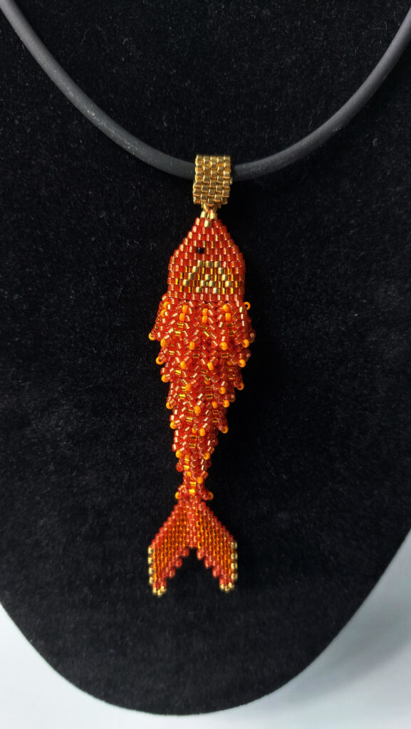De hanger ziet er aan de voorkant en achterkant hetzelfde uit. De sluiting is gemaakt van roestvrij staal, dus ook bij een gevoelige huid veilig te dragen. De lengte van de (caoutchouc) ketting is circa 50 cm. De lengte van de vis is circa 9 cm. Er zijn meer dan 1400 kraaltjes verwerkt in dit sieraad.