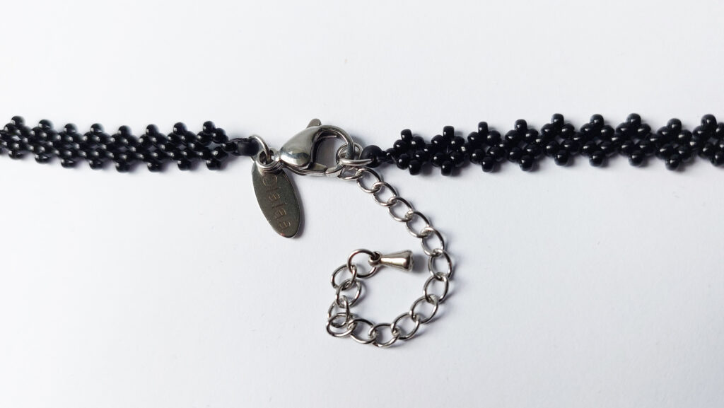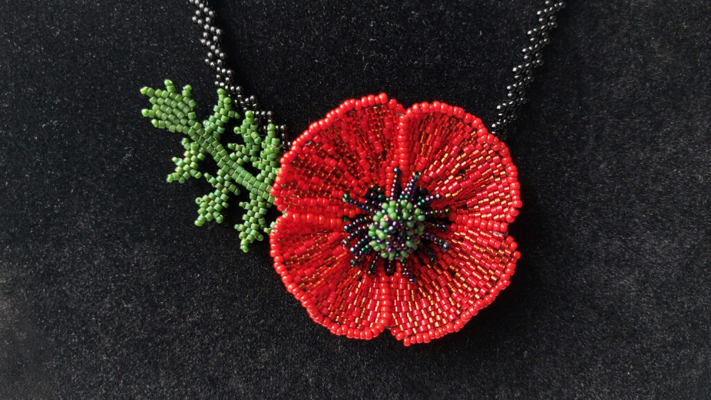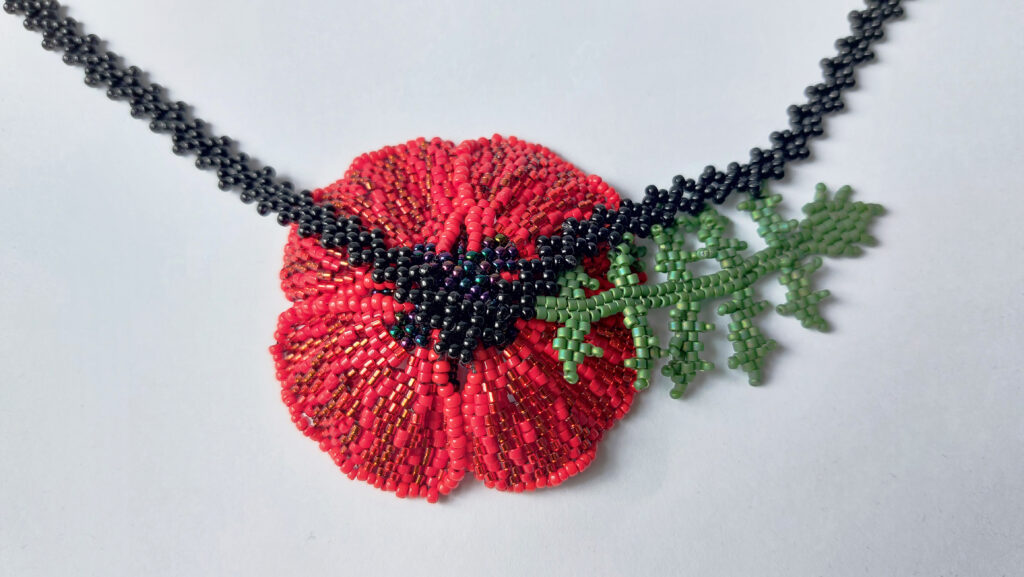 De sluiting is gemaakt van roestvrij staal, dus ook bij een gevoelige huid veilig te dragen. De lengte van de ketting is circa 45 cm met een extra verlengkettinkje van circa 5 cm. De klaproos is circa 5 cm in doorsnee (excl. groen blad). Er zijn meer dan 2000 kraaltjes verwerkt in dit sieraad.