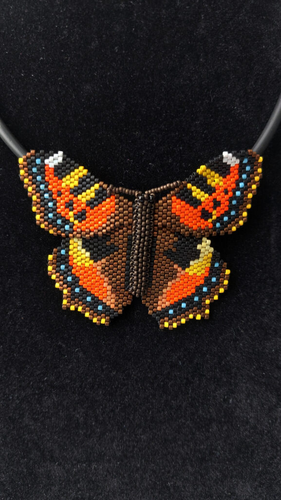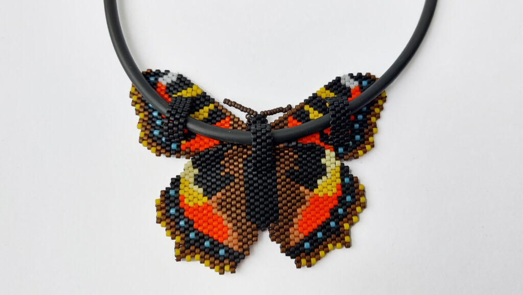 De sluiting is gemaakt van roestvrij staal, dus ook bij een gevoelige huid veilig te dragen. De lengte van de ketting is circa 45 cm. De vlinder is circa 7,5 cm breed. Er zijn bijna 1500 kraaltjes verwerkt in dit sieraad.