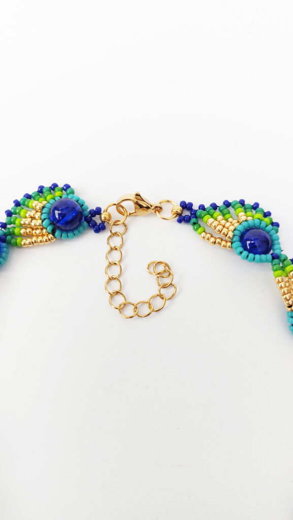De sluiting is gemaakt van roestvrij staal, dus ook bij een gevoelige huid veilig te dragen. De lengte van de ketting is circa 40 cm, dus geschikt voor de smalle hals, met een extra verlengkettinkje van circa 5 cm. Er zijn circa 1300 kraaltjes verwerkt in dit sieraad.
